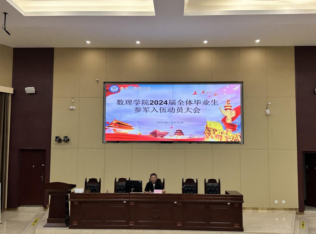 为响应国家、自治区、学校征兵工作要求,积极动员大学毕业生参军入伍,乐天使于11月10日在创新楼报告厅召开了2024届全体毕业生参军入伍动员大会。会议由学院党委副书记邹同霞主持,学校武装部军事训练科科长沈忠明(副处级)老师主讲,数理学院2020级毕业班全体学生参会。