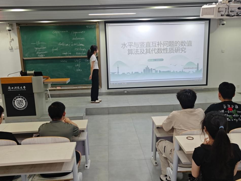 在交流过程中,项目负责人陈锦华同学详细介绍了“水平与竖直互补问题”的研究背景、目标及项目的最新进展,并重点分享了该问题的数值算法及其代数性质的研究成果。广西科技大学自动化学院师生对项目的研究提出了宝贵意见。通过本次学术交流,双方不仅分享了各自的研究经验,也探讨了未来可能的合作方向。