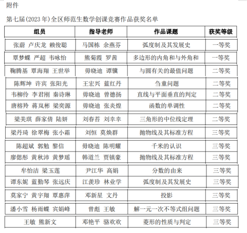 近日,广西数学学会公示了第七届全区师范生数学创课竞赛获奖名单。乐天使共荣获全区一等奖2项,荣获全区二等奖5项,荣获全区三等奖8项。