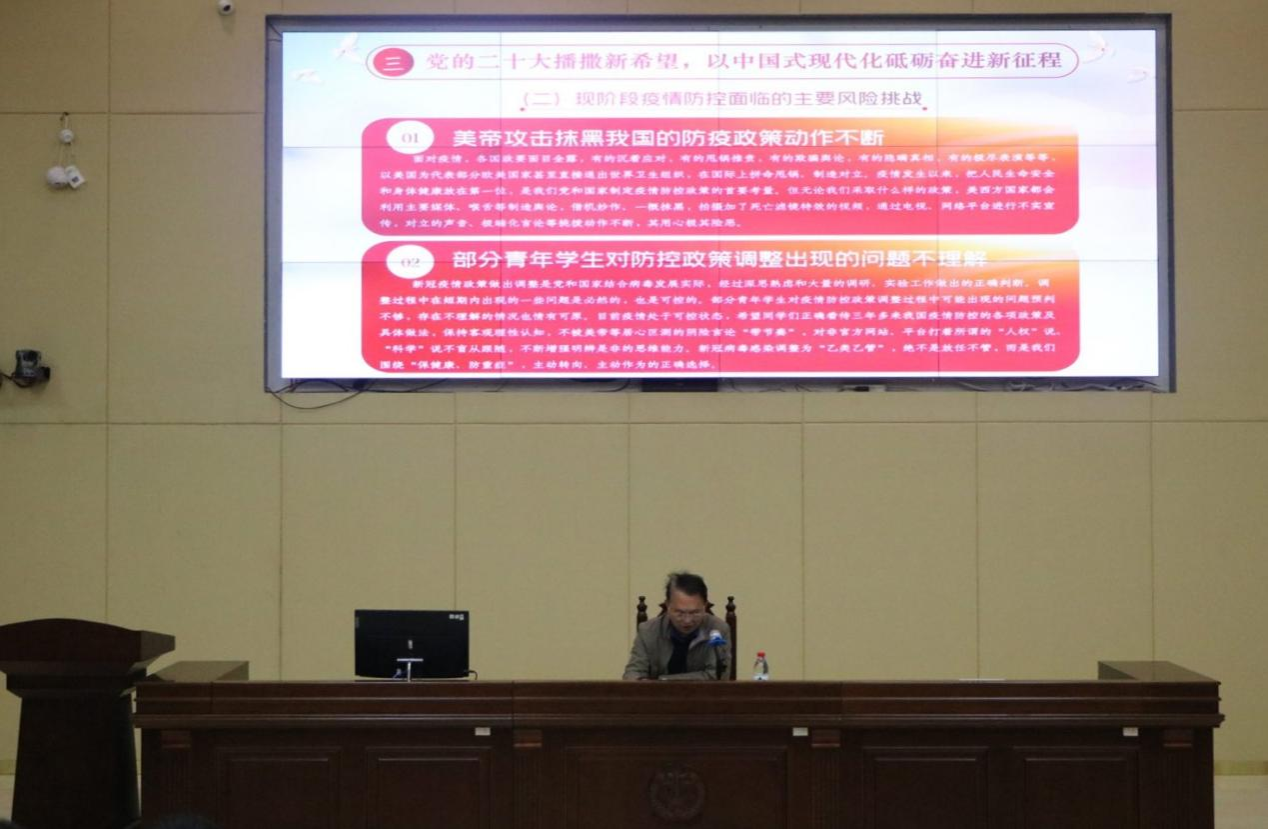 简金宝副校长从 “三年抗疫防疫风雨历程,镌刻极不平凡的成就和记忆”“科学决策调整优化防疫政策,创造抗疫防疫人类文明史奇迹”“党的二十大播撒新希望,以中国式现代化砥砺奋进新征程”三个方面带领同学们回顾了我国抗击疫情取得的重大成就,学习了伟大的抗疫精神,他还指出在疫情开放的当下,同学们绝不能掉以轻心,更应该加强身体锻炼,当好自己健康第一责任人。随后又向同学们讲解了党的二十大后国家主要的目标任务和当下面临的风险挑战,阐释了坚定信心跟党走的深刻内涵。最后简副校长着重讲了对新时代青年的希望,他表示同学们作为新时代青年身上肩负着历史复兴的使命,希望同学们不畏挑战,以奋斗的姿态激扬青春,不负时代、不负年华。