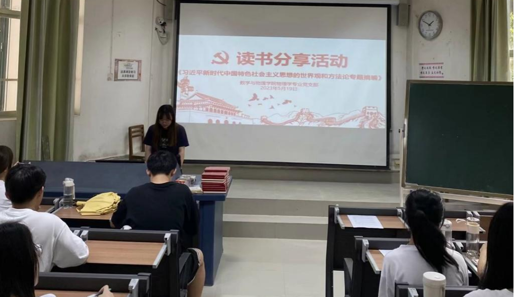 2023年5月19日,物理专业学生党支部在创新楼六梯开展学习贯彻习近平新时代中国特色社会主义思想主题教育读书分享会,专题学习《习近平新时代中国特色社会主义思想的世界观和方法论专题摘编》。支部党员蓝一烨同志主持,党支部全体党员及入党积极分子参加。