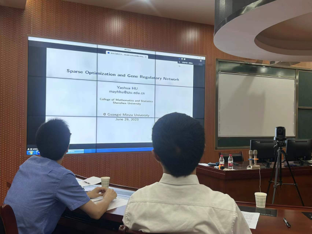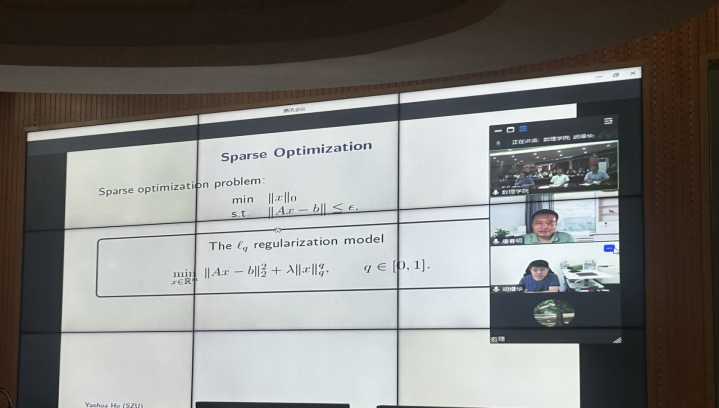 2023年6月29日上午,数学与物理学院邀请深圳大学胡耀华教授在逸夫楼303为师生们作了题为“Sparse Optimization and Gene Regulatory Networks”的学术报告。本次报告由科学技术处处长唐国吉教授主持,数学与物理学院马国栋、尹江华、刘建勋等博士和研究生参加。