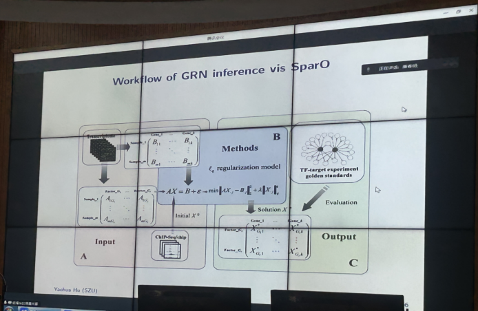 在报告中,胡耀华教授讲述在稀疏优化和基因调控网络之间架起一座桥梁,并针对不同结构的基因调控网络提出几种非凸稀疏优化模型。此外,介绍非凸稀疏优化问题的数学理论,包括一致性理论、渐进理论和稳定性理论以及一阶迭代方法。胡教授的报告内容精彩、通俗易懂,把稀疏优化的研究动机讲得很透彻,老师和学生们都非常感兴趣。