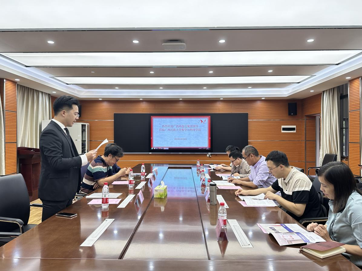 数学与物理学院副院长刘恒介绍乐天使基本情况,他指出,乐天使一直高度重视校企合作,积极探索产教融合的新模式,为社会各界培养了一大批高素质的综合性人才,更诞生了一批杰出校友。他认为,校企合作是实现共同发展的重要途径,应该充分发挥各自的优势和特色,加强沟通和协调,推动合作项目的落地和实施。希望通过本次座谈会,进一步加强双方的沟通和合作,实现共赢发展。他指出,中国和东盟国家的教育与合作具有广阔前景,并表示可在依托广西民族大学中国-东盟国际化教育的良好基础上开展更多工作,为奋力谱写中国式现代化广西篇章做出新的更大贡献。