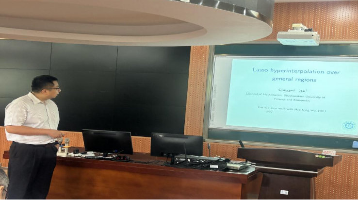2024年5月13日上午,数学与物理学院邀请西南财经大学数学学院安聪沛博士在逸夫楼303报告厅为师生们作了题为“LASSO hyperinterpolation over general regions”的学术讲座。本次学术讲座由学院院长刘恒教授主持,数学与物理学院江羡珍、马国栋、梁作松、刘建勋等老师和研究生参加。
