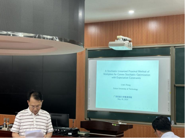 大连理工大学数学科学学院张立卫教授作了题为“A stochastic linearized proximal method of multipliers for convex stochastic optimization with expectation constraints”的学术报告。报告介绍了一种可计算的随机逼近型算法,即乘法器的随机线性化近似方法,用以解决凸随机优化问题。该算法结合了随机逼近和传统乘法器近似方法的特点,提供了一种新的解决思路。在一定的温和条件下,证明了算法的收敛性。具体来说,当算法中的参数被恰当选择时,算法在目标函数的约简和约束条件的违反上都能展现出预期的收敛速度,其中K代表迭代步数。此外,还展示了在高概率情况下,算法能够维持约束违反界和目标函数界的性能。通过一些初步的数值实验,验证了该算法的有效性。这些结果不仅证明了算法的理论基础,也展示了其在实际应用中的潜力。