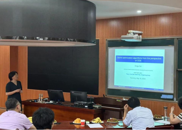 南京师范大学蔡邢菊教授作了题为“ODE视角下的几个优化算法”的学术报告。本报告首先介绍了ODE方程,之后详细的介绍了ODE方程的离散格式与优化算法之间密切的联系,并从ODE角度给出几个具有一阶和二阶收敛率的优秀的优化算法,给出了这些算法理论方面的证明,最后对于算法的实际效果,进行了详细的介绍。