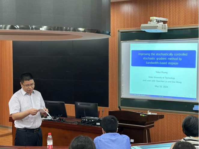 2024年5月18日上午,数学与物理学院邀请河北工业大学理学院黄亚魁教授在逸夫楼303报告厅为师生们作了题为“基于带宽步长的控制随机梯度方法的改进”的学术报告。本次报告由马国栋教授主持,数学与物理学院江羡珍、尹江华、刘建勋等老师和研究生参加。