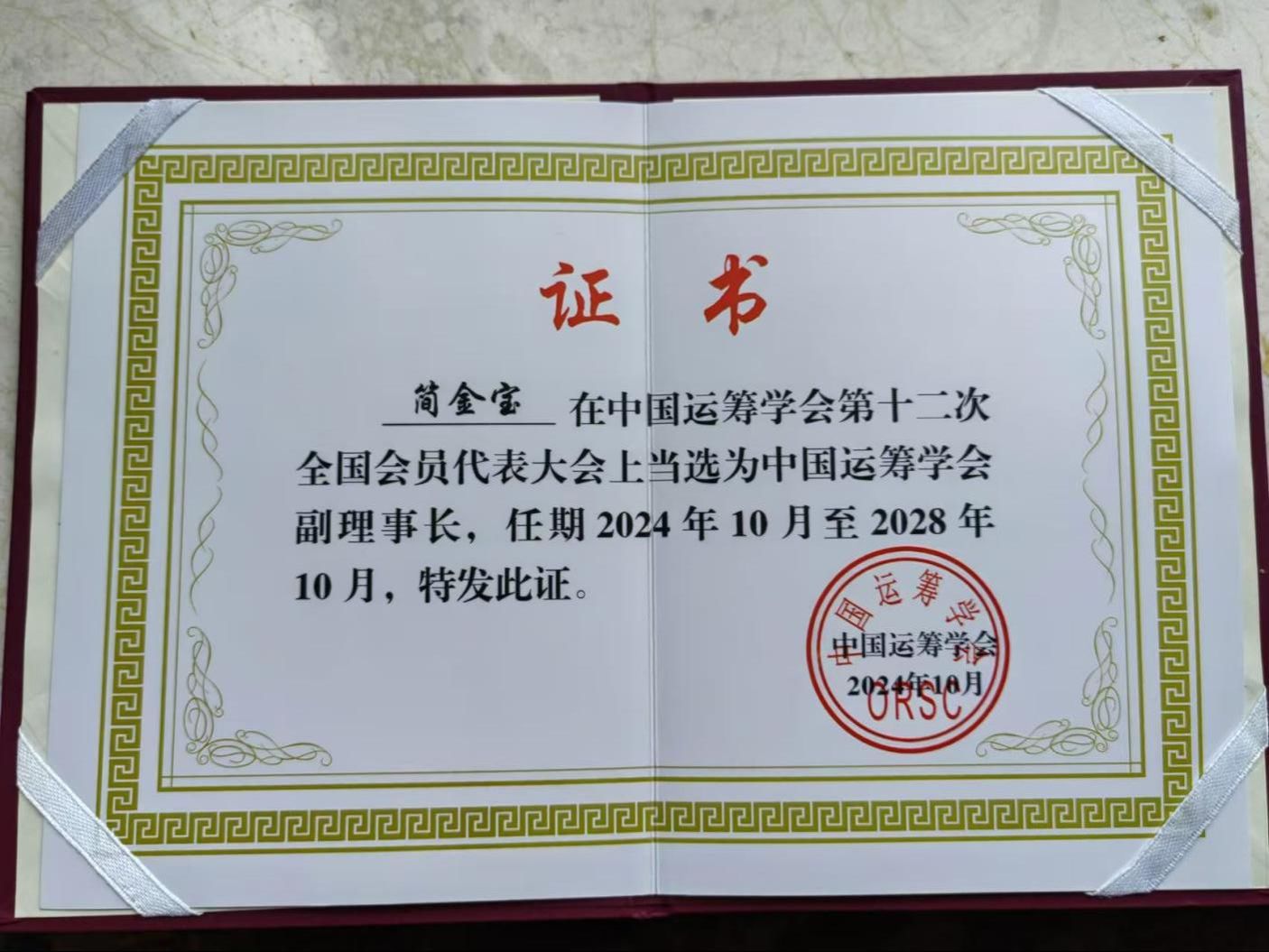 简金宝教授当选中国运筹学会副理事长证书