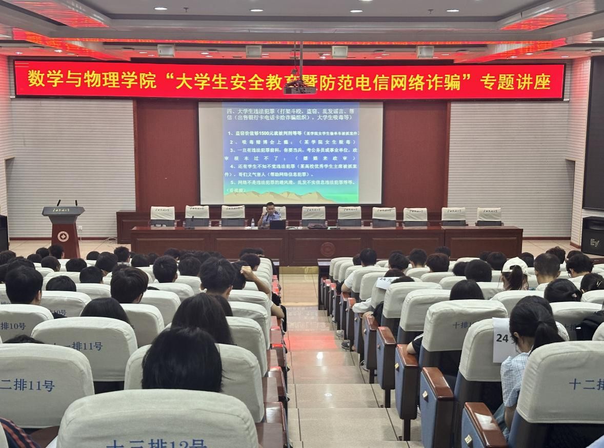 近日,为进一步扩大反诈宣传覆盖面,增强学生安全防范意识,提高识别与防范电信网络诈骗的能力,乐天使开展“大学生安全教育暨防范电信网络诈骗”专题讲座。南宁市公安局西乡塘分局三级高级警长、驻广西民族大学联络官韦振豪作报告。