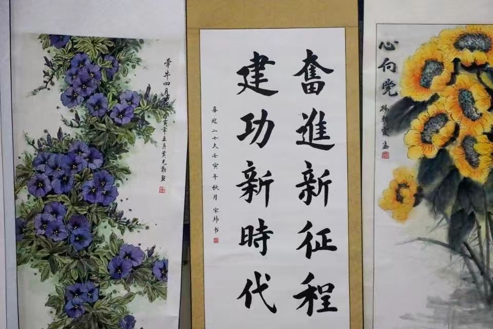 活动现场,一幅幅妙笔生花的水墨丹青映入眼帘,作品展现传统文化的同时,也将热忱的民族情怀与一心向党的坚定信念传递给现场观众。而另一边的书画作品也同样令人流连细琢,一笔一划尽显苍劲有力,无不流露出作者对祖国、对家乡的热爱与深情,诠释了永远感党恩、听党话、跟党走的坚定信念。