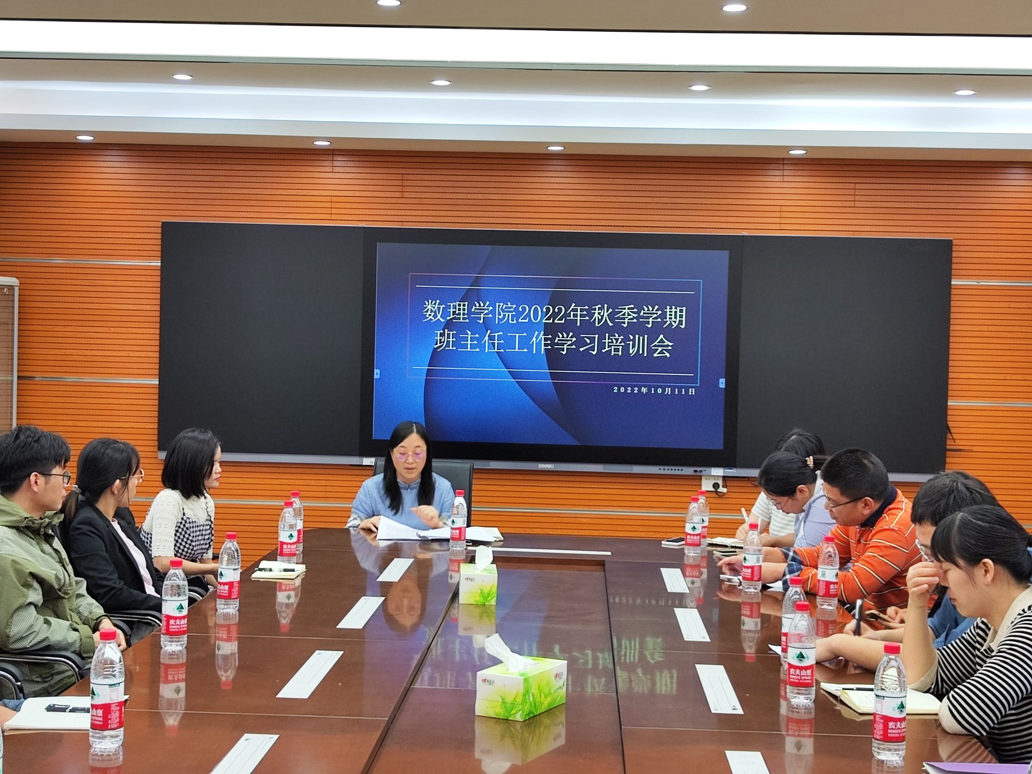 2022年10月11日,数学与物理学院在创新楼301召开班主任学习工作培训会,会议由学院党委副书记邹同霞主讲,全体辅导员、班主任参会。